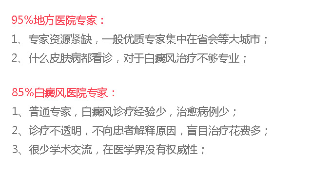 地方白癜风医院多数为不正规民营医院,聘请几个执业医生通过包装后坐诊看病,经验不足,花钱多,效果慢。
